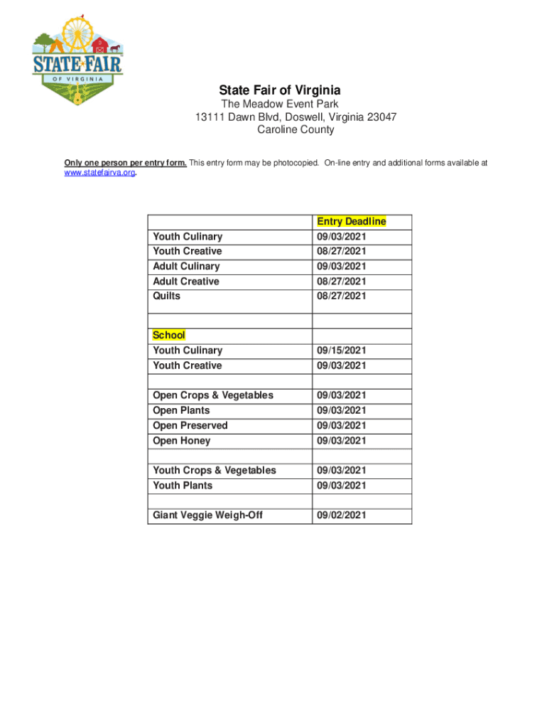 State Fair of Virginia The Meadow Event Park 13111 Dawn Blvd, Roswell, Virginia 23047 Caroline County Only one person per entry form. This entry form may be photocopied. Online entry and additional