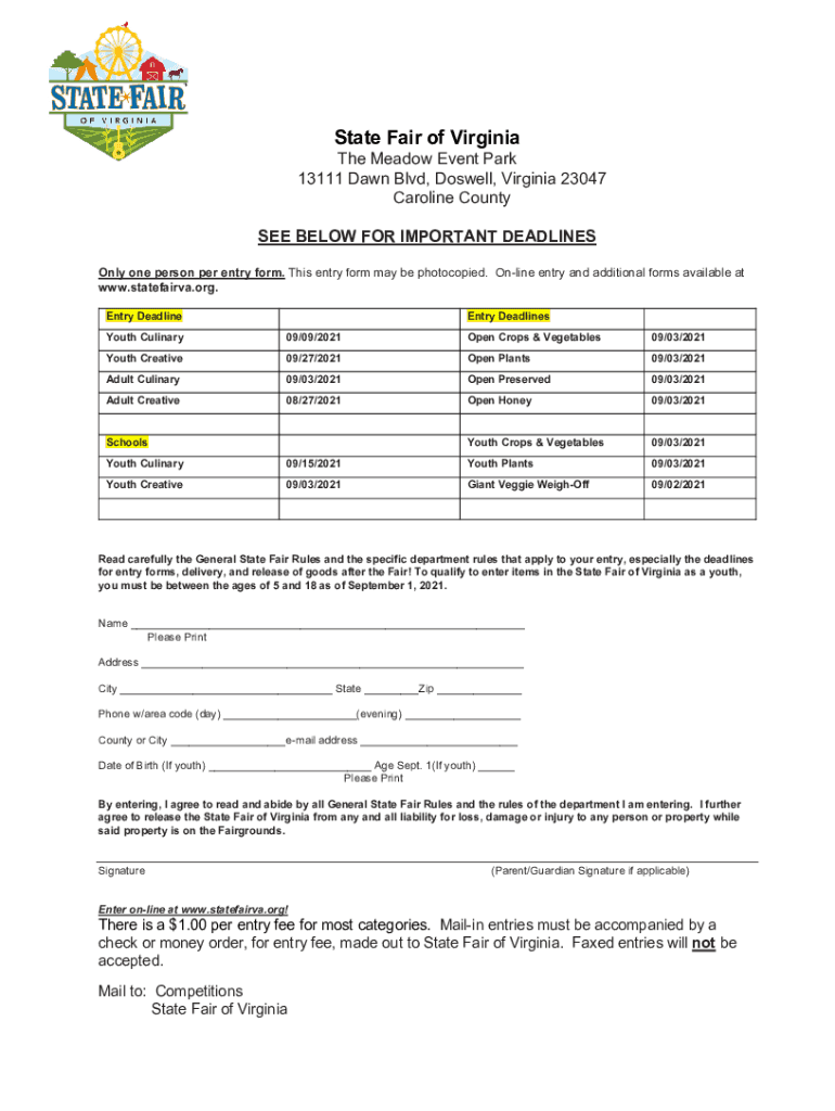 State Fair of Virginia Meadow Event Park 13111 Dawn Blvd, Roswell, Virginia 23047 Caroline County SEE BELOW FOR IMPORTANT DEADLINES Only one person per entry form. This entry form may be photocopied.