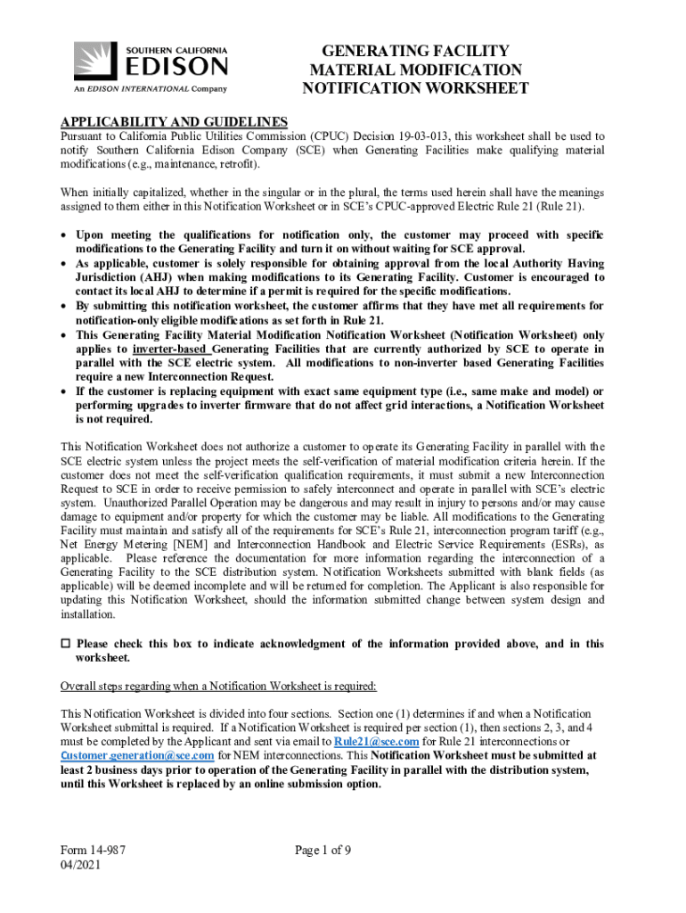 Southern California Edison Rose mead, California (U 338E)Original Cancelling. PUC Sheet No. Cal. PUC Sheet No.70959ESheet 1Generating Facility Material Modification Notification Worksheet Form 14987(Continued)