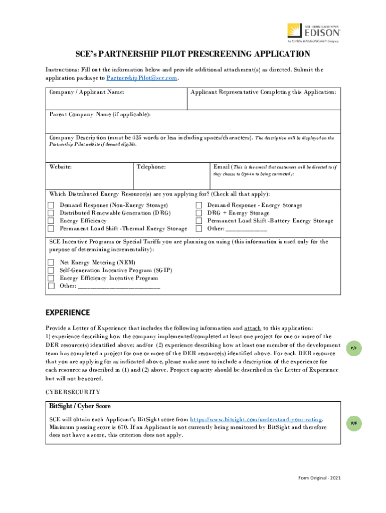 Sees PARTNERSHIP PILOT PRESCREENING APPLICATION Instructions: Fill out the information below and provide additional attachment(s) as directed. Submit the application package to PartnershipPilot@sce.com.