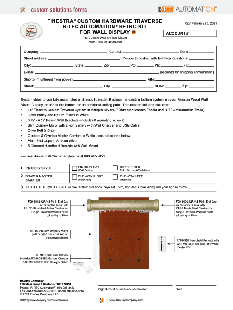 Custom solutions forms The FINEST CUSTOM HARDWARE TRAVERSE REC AUTOMATION RETRO KIT FOR WALL DISPLAY Fits Custom Wall or Floor Mount Pinch Pleat or RipplefoldCompany:Contact:Street address: City:REV