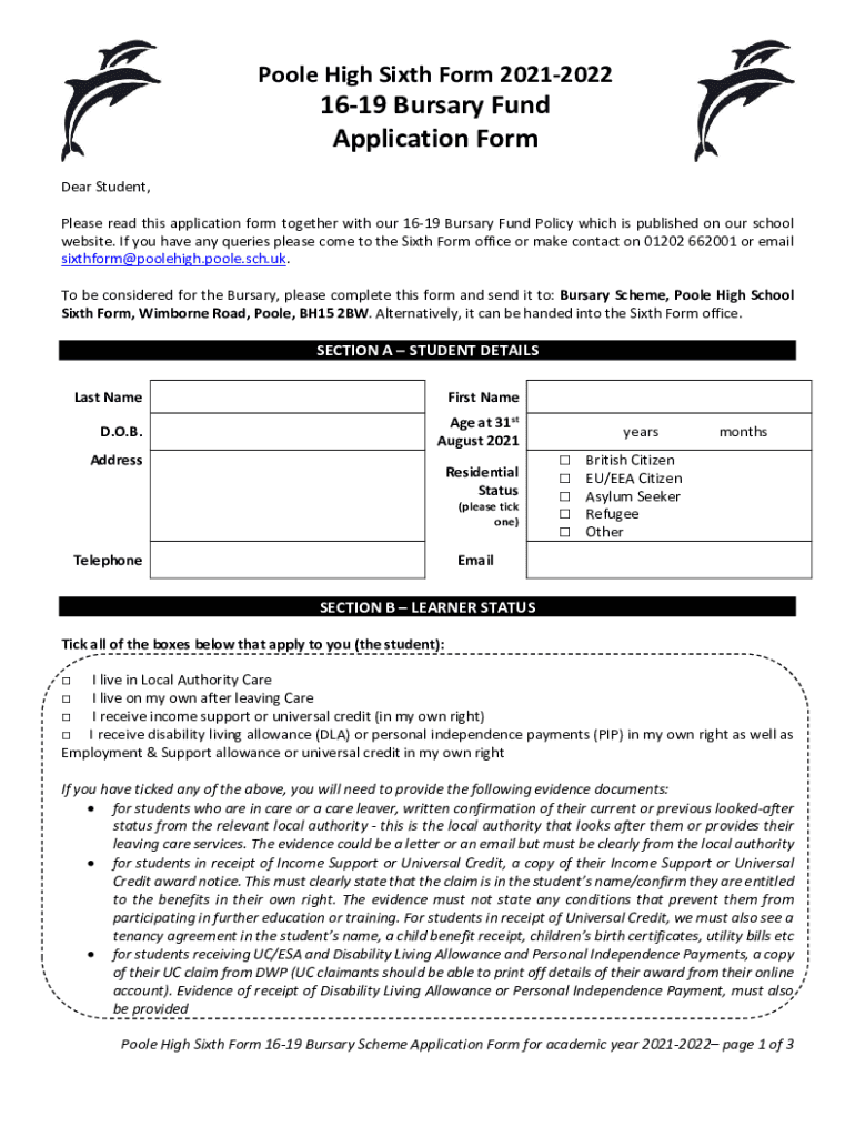 Poole High Sixth Form 202120221619 Bursary Fund Application Former Student, Please read this application form together with our 1619 Bursary Fund Policy which is published on our school website. If