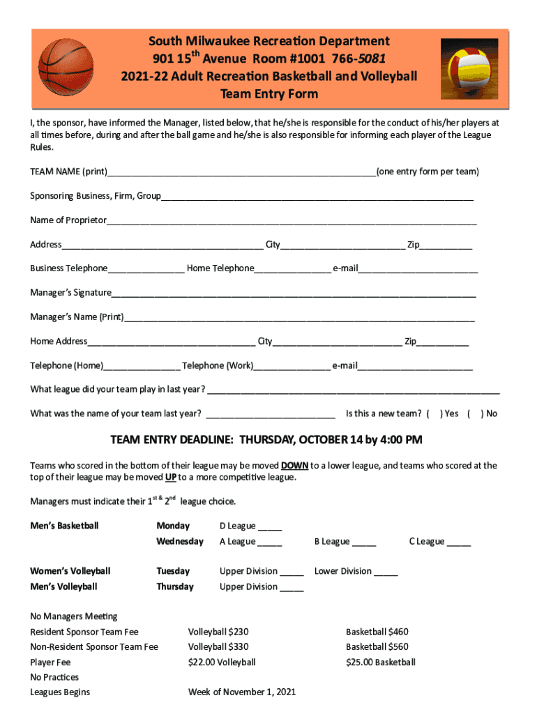 South Milwaukee Recreation Department 901 15th Avenue Room #1001 7665081 202122 Adult Recreation Basketball and Volleyball Team Entry Form I, the sponsor, have informed the Manager, listed below,