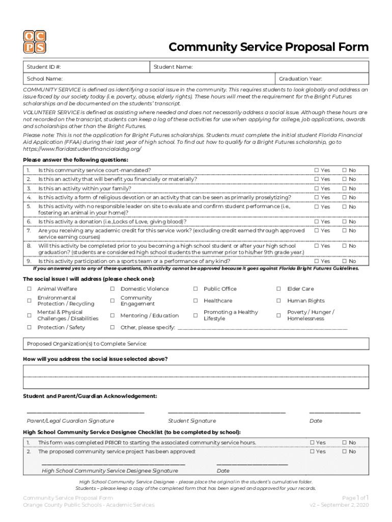 Anyone who wishes to propose a community service project or initiative may need to fill out a community service proposal form.