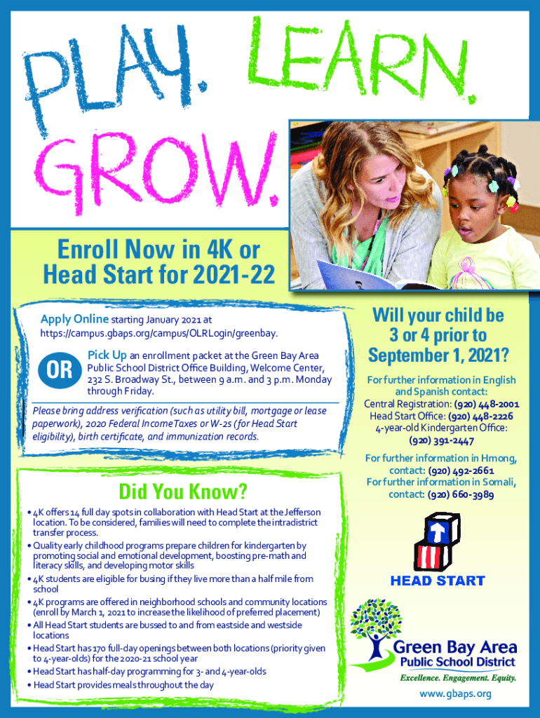 L E A. R N Y. An LP GROW. Enroll Now in 4K or Head Start for 202122Apply Online starting January 2021 HTTPS://campus.gbaps.org/campus/OLRLogin/greenbay.ORPick Up an enrollment packet at the Green
