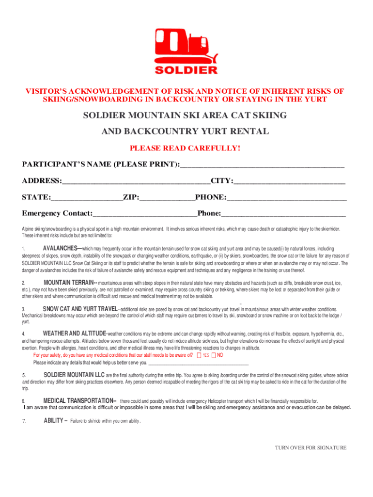 VISITORS ACKNOWLEDGEMENT OF RISK AND NOTICE OF INHERENT RISKS OF SKIING/SNOWBOARDING IN BACKCOUNTRY OR STAYING IN THE YURTSOLDIER MOUNTAIN SKI AREA CAT SKIING AND BACKCOUNTRY YURT RENTAL PLEASE READ