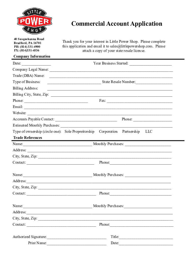 Commercial Account Application 40 Susquehanna Road Bradford, PA 16701 PH: (814) 3314900 FX: (814)3314536Thank you for your interest in Little Power Shop. Please complete this application and email