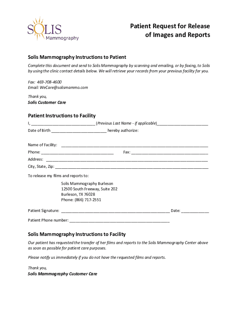 Patient Request for Release of Images and Reports Solis Mammography Instructions to Patient Complete this document and send to Solis Mammography by scanning and emailing, or by faxing, to Solis by