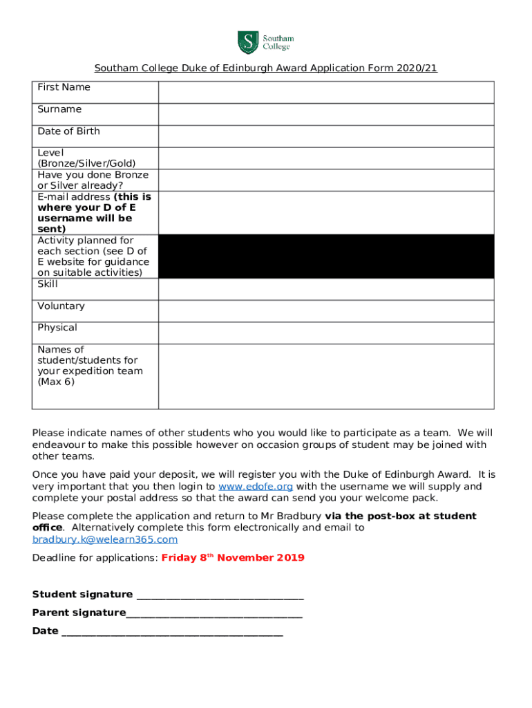 What is Southam College Duke of Edinburgh Award Application 2020/21 Form?