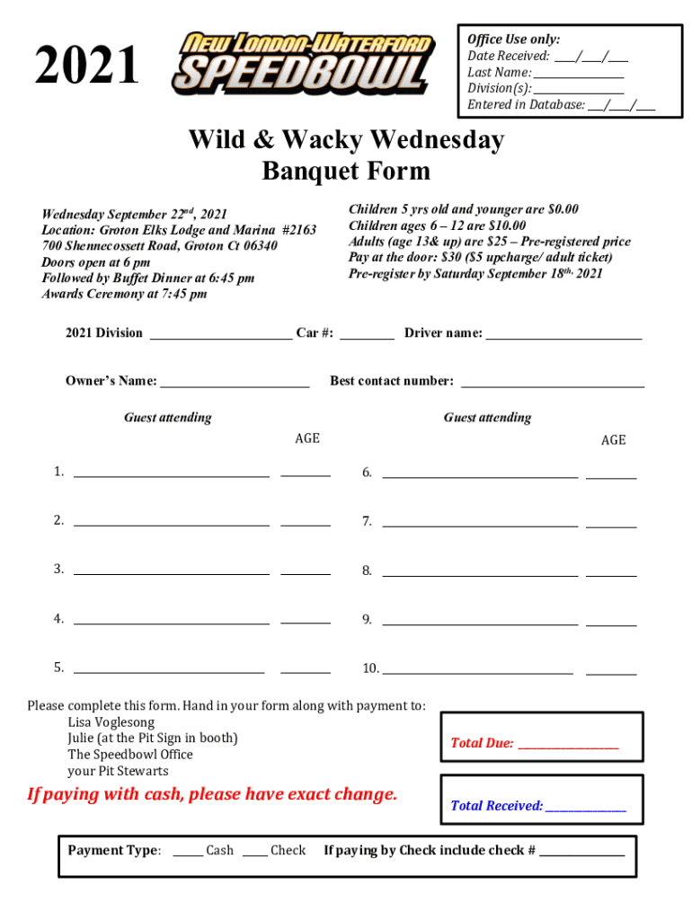 2021Office Use only: Date Received: / / Last Name: Division(s): Entered in Database: / / Wild & Wacky Wednesday Banquet Form Children 5 yrs old and younger are $0.00 Children ages 6 12 are $10.00