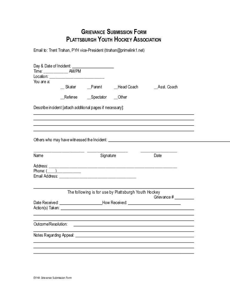 GRIEVANCE SUBMISSION FORM PITTSBURGH YOUTH HOCKEY ASSOCIATION Email to: Trent Trajan, pH vicePresident (Trajan primelink1.net) Day & Date of Incident: Time: AM/PM Location: You are a: Skater Parent