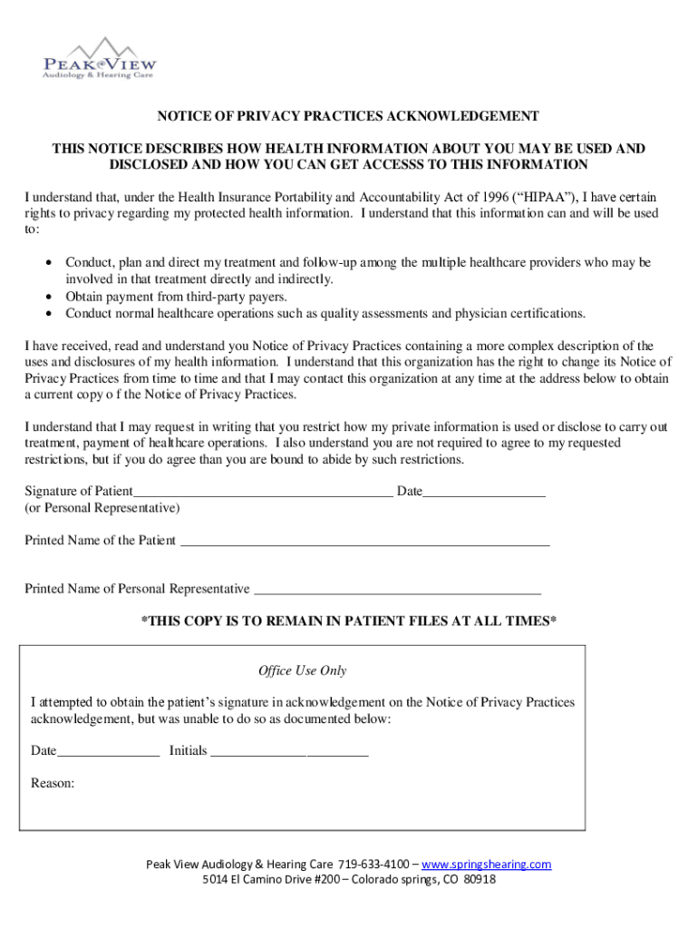 NOTICE OF PRIVACY PRACTICES ACKNOWLEDGEMENT THIS NOTICE DESCRIBES HOW HEALTH INFORMATION ABOUT YOU MAY BE USED AND DISCLOSED AND HOW YOU CAN GET ACCESS TO THIS INFORMATION I understand that, under
