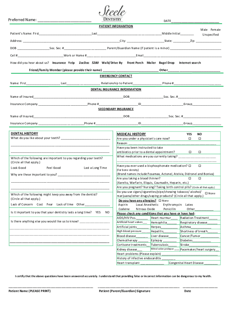 Preferred Name: DATE PATIENT INFORAMTIONPatients Name: First Last Middle Initial Male Female UnspecifiedAddress: City: State: Zip: DOB Soc. Sec. # Parent/Guardian Name (if patient is a minor) Cell
