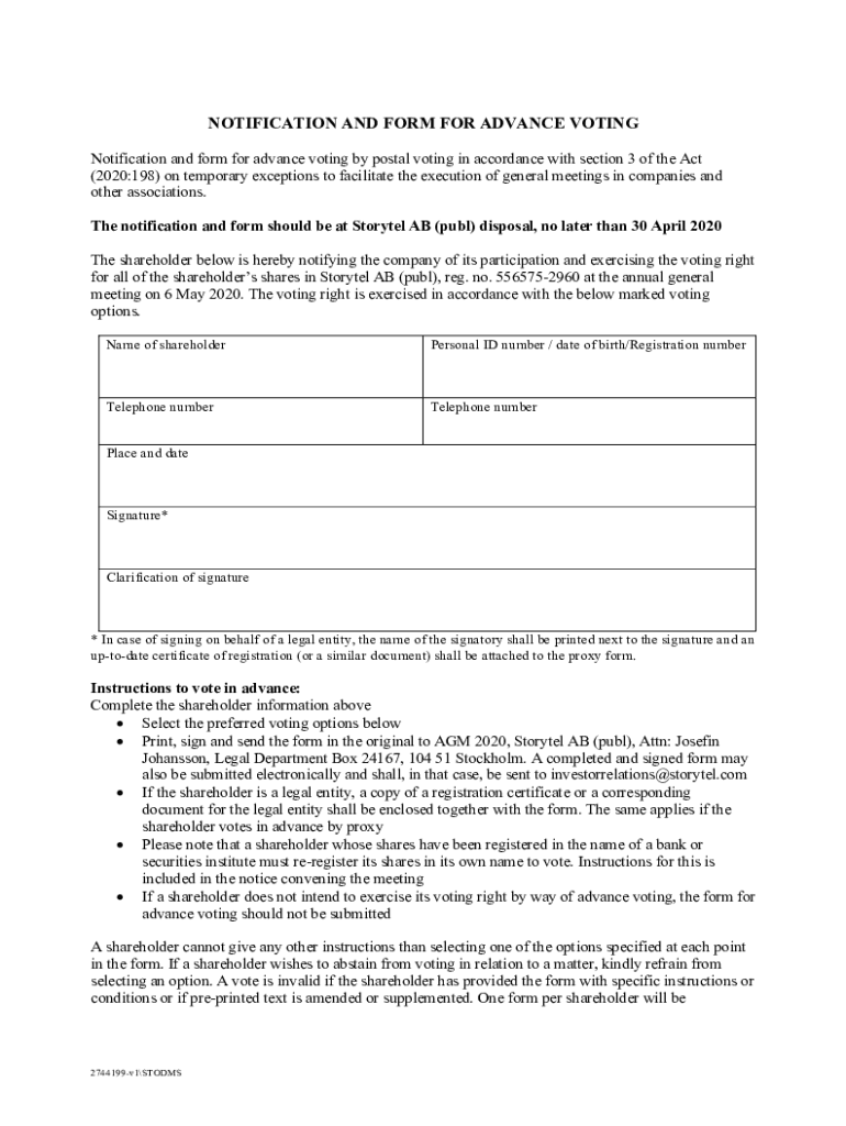 NOTIFICATION AND FORM FOR ADVANCE VOTING Notification and form for advance voting by postal voting in accordance with section 3 of the Act (2020:198) on temporary exceptions to facilitate the execution