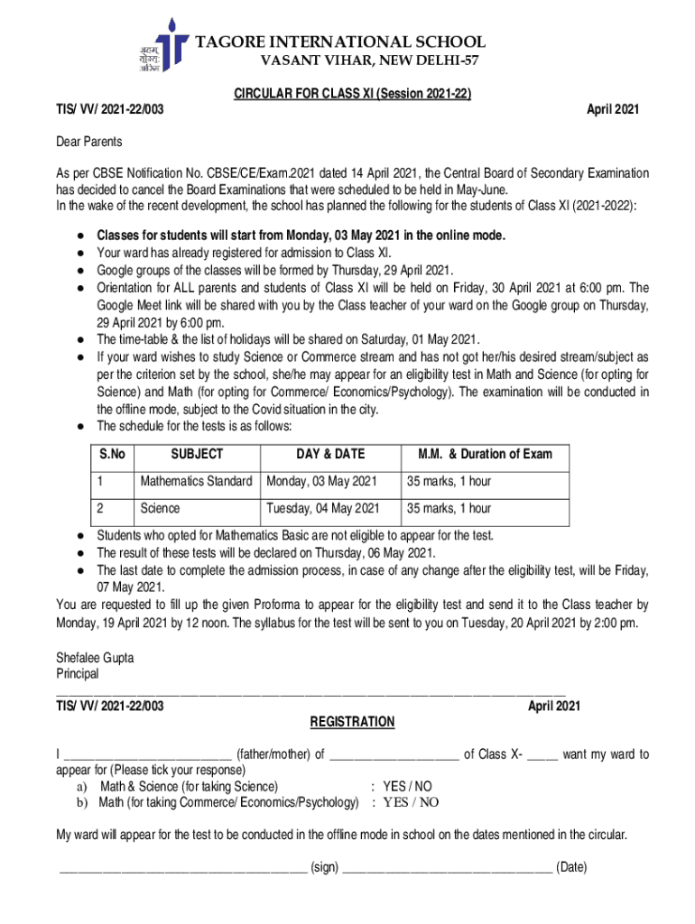 TAGORE INTERNATIONAL SCHOOL VACANT VICAR, NEW DELHI57 CIRCULAR FOR CLASS XI (Session 202122)TIS/ VS/ 202122/003April 2021Dear Parents As per CBSE Notification No. CBSE/CE/Exam.2021 dated 14 April