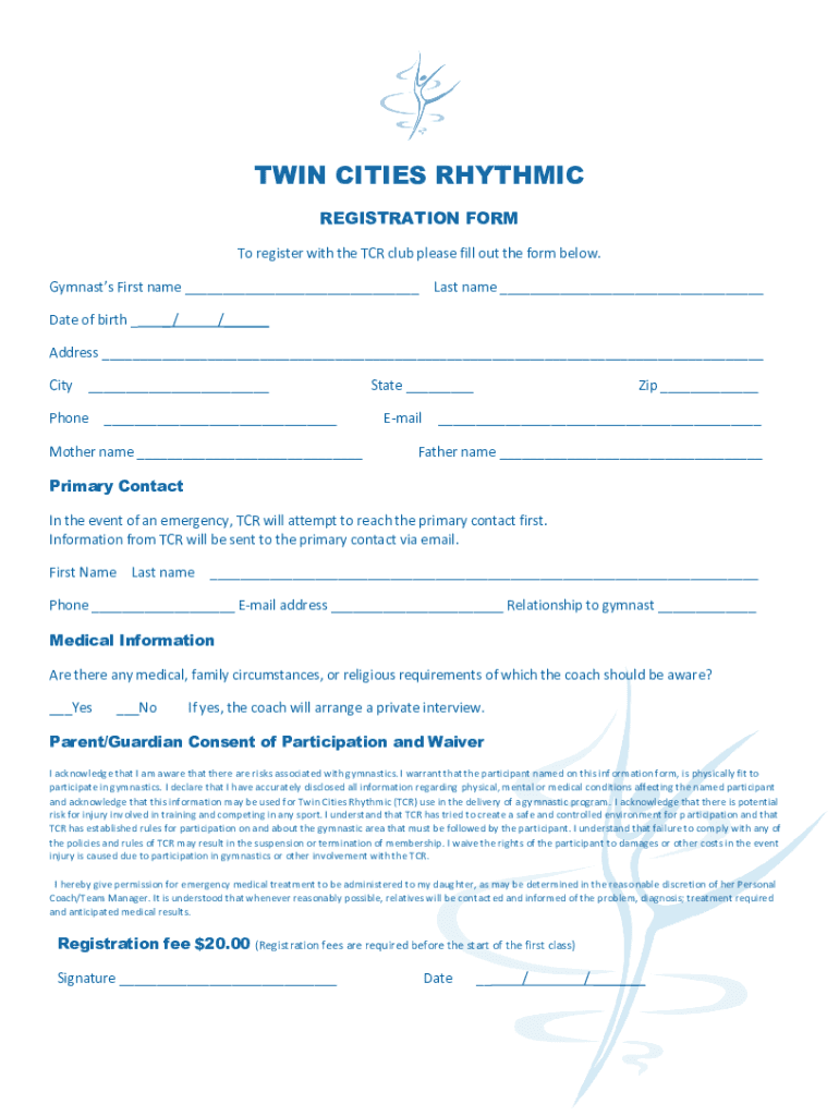 TWIN CITIES RHYTHMIC REGISTRATION FORM To register with the TCR club please fill out the form below. Gymnasts First name Date of birth /Last name / Address City Phone Mother name State Email Father