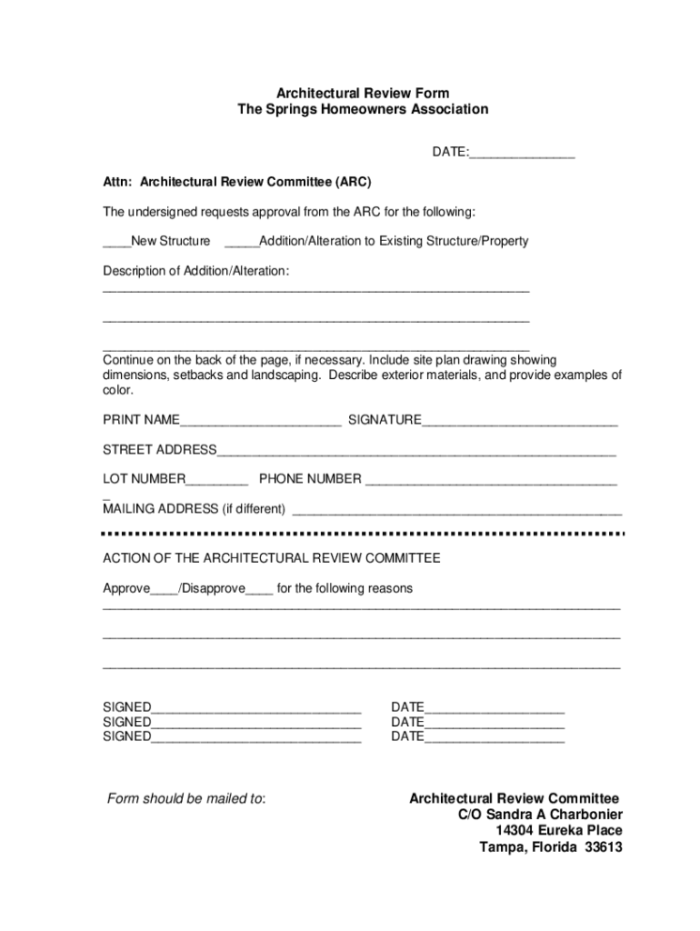 Architectural Review Form The Springs Homeowners Association DATE: Attn: Architectural Review Committee (ARC) The undersigned requests approval from the ARC for the following: New Structure Addition/Alteration