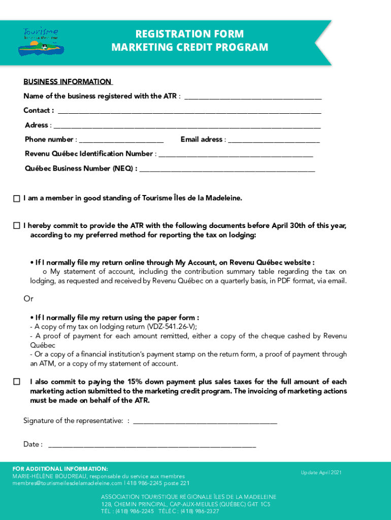 REGISTRATION FORM MARKETING CREDIT PROGRAM BUSINESS INFORMATION Name of the business registered with the ATR : Contact : Address : Phone number : Email address : Revenue Quebec Identification Number