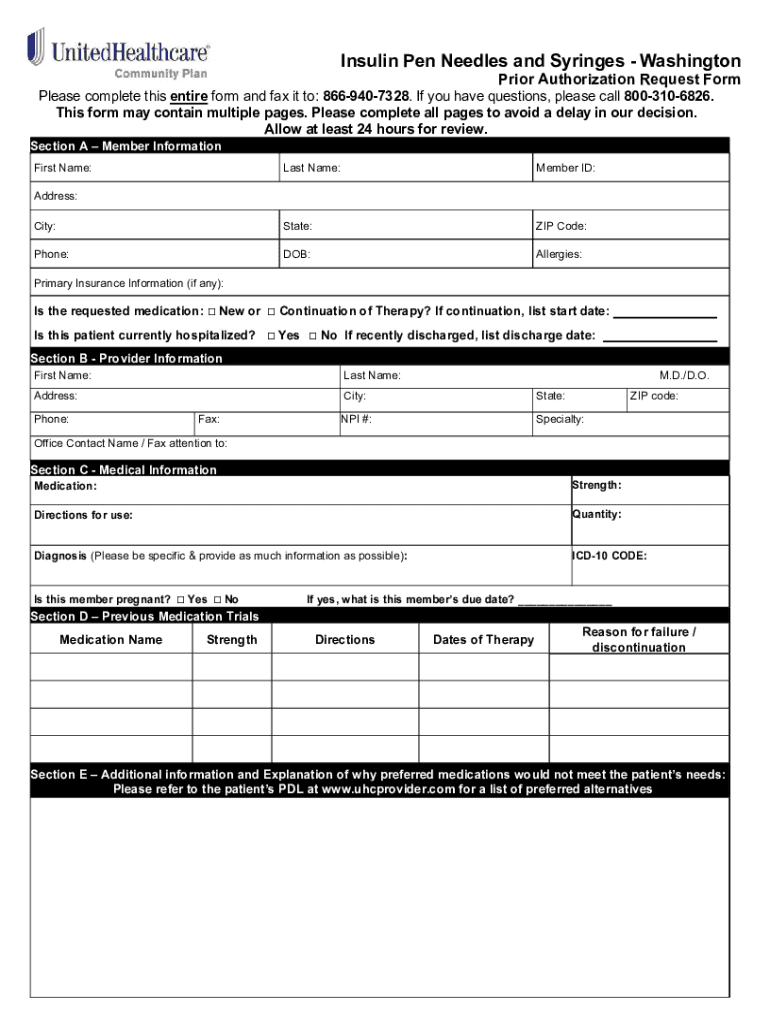 Pen Needles and Syringes WashingtonPrior Authorization Request Formulas complete this entire form and fax it to: 8669407328. If you have questions, please call 8003106826. This form may contain multiple