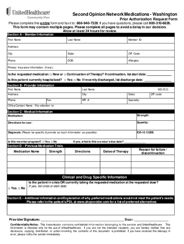 Second Opinion Network Medications Washington Prior Authorization Request Form Please complete this entire form and fax it to: 8669407328. If you have questions, please call 8003106826. This form
