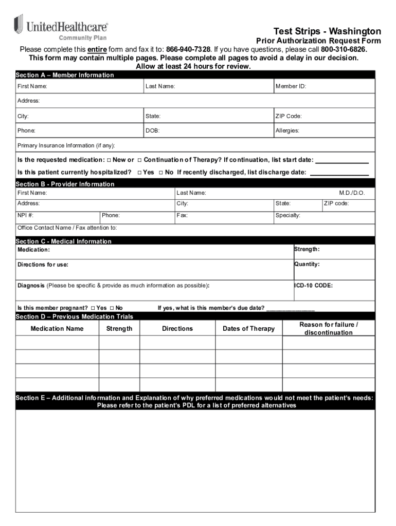 Test Strips WashingtonPrior Authorization Request Formulas complete this entire form and fax it to: 8669407328. If you have questions, please call 8003106826. This form may contain multiple pages.