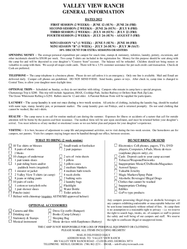 VALLEY VIEW RANCH GENERAL INFORMATION DATES 2022 FIRST SESSION (2 WEEKS) JUNE 12 (SUN) JUNE 24 (FRI) SECOND SESSION (2 WEEKS) JUNE 26 (SUN) JULY 8 (FRI) THIRD SESSION (2 WEEKS) JULY 10 (SUN) JULY