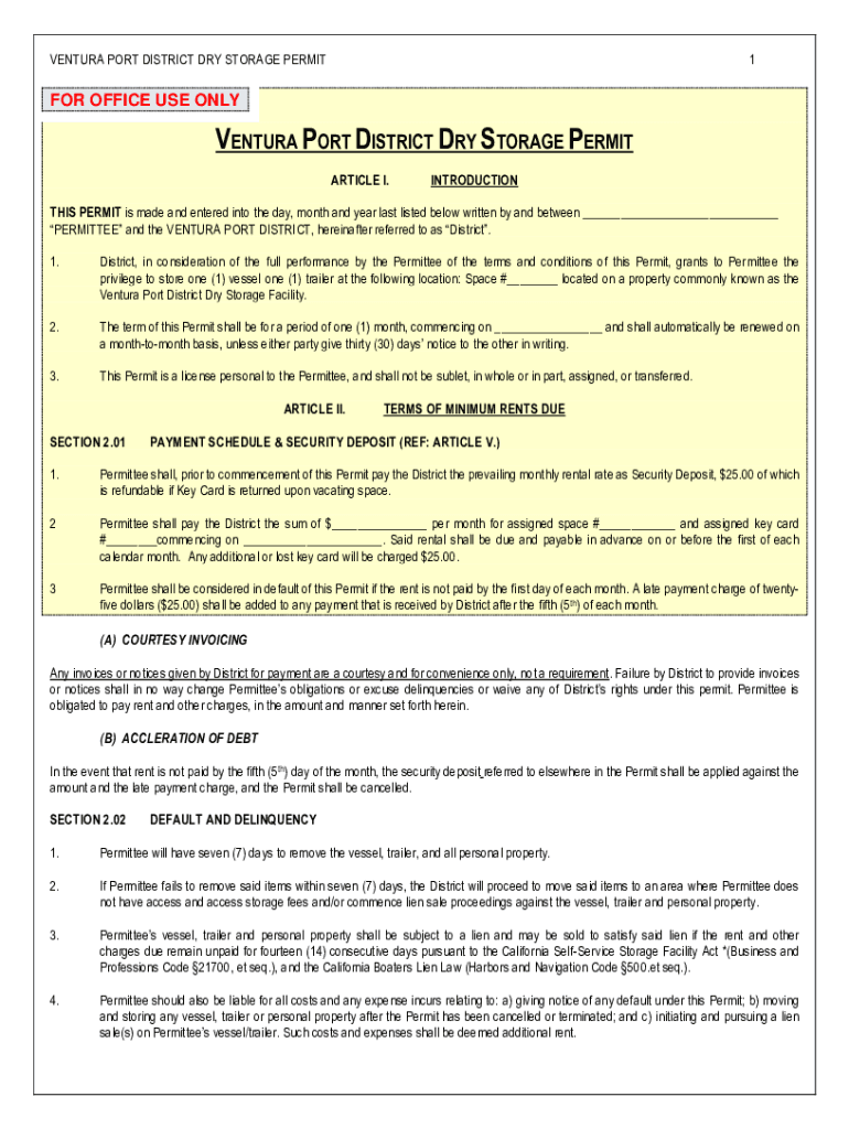 VENTURA PORT DISTRICT DRY STORAGE PERMIT1FOR OFFICE USE ONLYVENTURA PORT DISTRICT DRY STORAGE PERMIT ARTICLE I.INTRODUCTIONS PERMIT is made and entered into the day, month and year last listed below