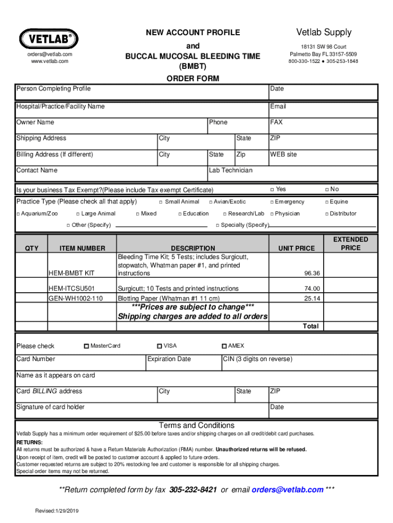 Orders@vetlab.com www.vetlab.comNEW ACCOUNT PROFILEVetlab Supply and BUCCAL MUCOSAL BLEEDING TIME (BMT)18131 SW 98 Court Palmetto Bay FL 331575509 8003301522 3052531848ORDER FORM Person Completing