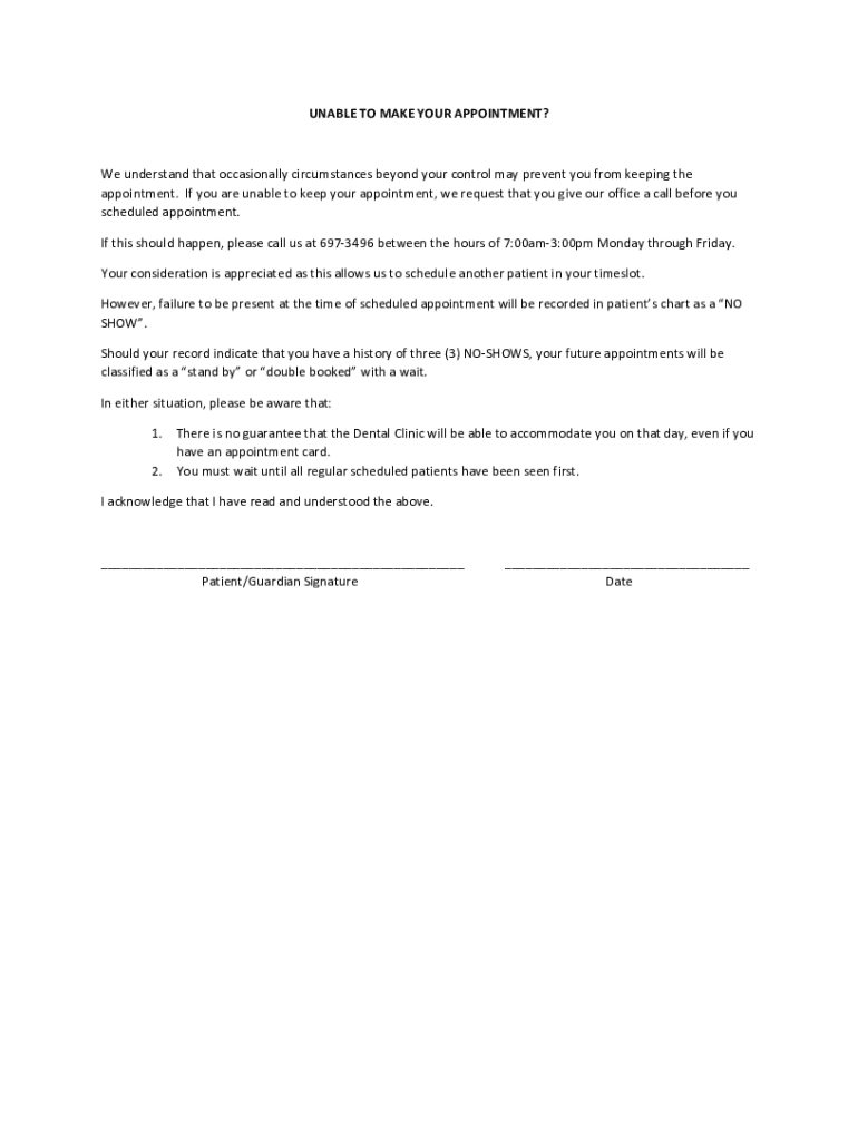 UNABLETOMAKEYOURAPPOINTMENT? Weunderstandthatoccasionallycircumstancesbeyondyourcontrolmaypreventyoufromkeepingthe appointment. Ifyouareunabletokeepyourappointment, werequestthatyougiveourofficeacallbeforeyou