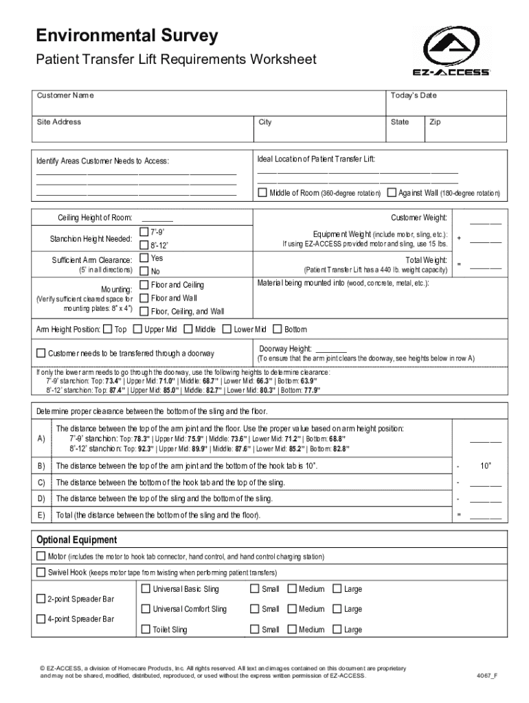 Environmental Survey Patient Transfer Lift Requirements Worksheet Customer NameTodays Date Site AddressCityIdentify Areas Customer Needs to Access: Ideal Location of Patient Transfer Lift: Middle