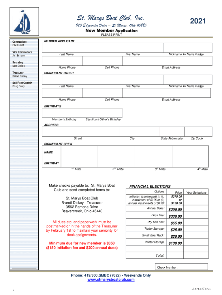 St. Mary's Boat Club, Inc.2021973 Edgewater Drive St Mary's, Ohio 45885 New Member Application PLEASE PRINT Commodore Phil FuerstMEMBER APPLICANTVice Commodore Jim BensonLast Name Secretary Matt Dickey