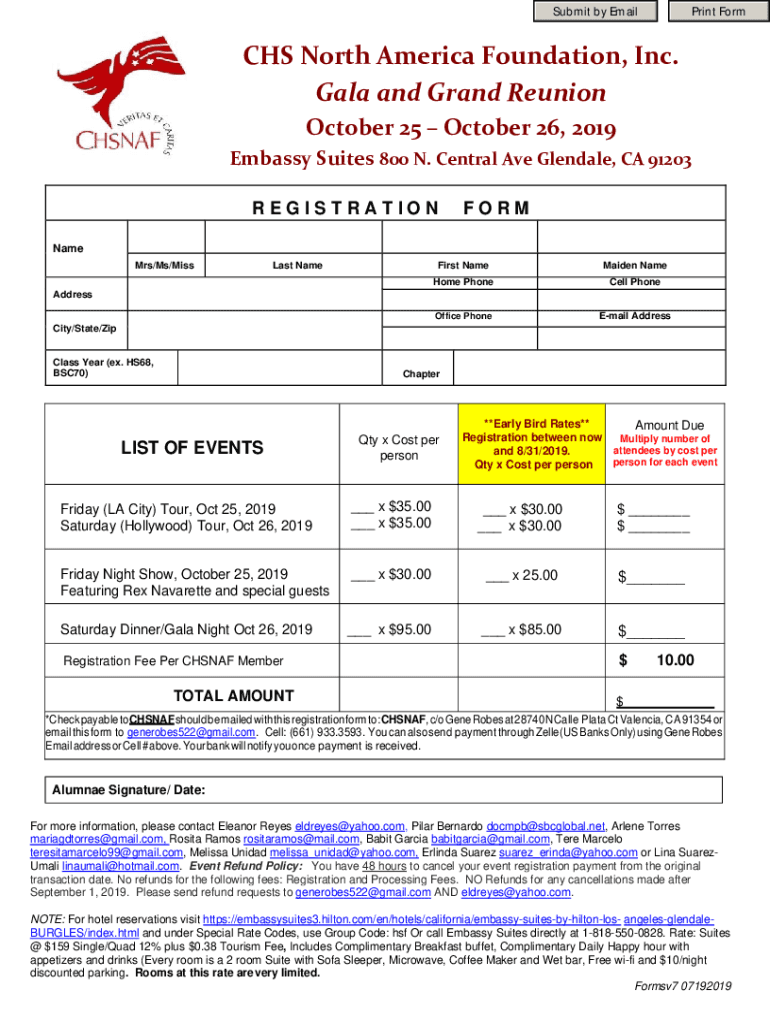 Submit by Emailing FormCHSNorthAmericaFoundation, Inc. GalaandGrandReunion October25October26,2019 EmbassySuites800N. CentralAveGlendale,CA91203 REGISTRATIONFORM Name Mrs/Ms/Miscast NameFirst Handmaiden