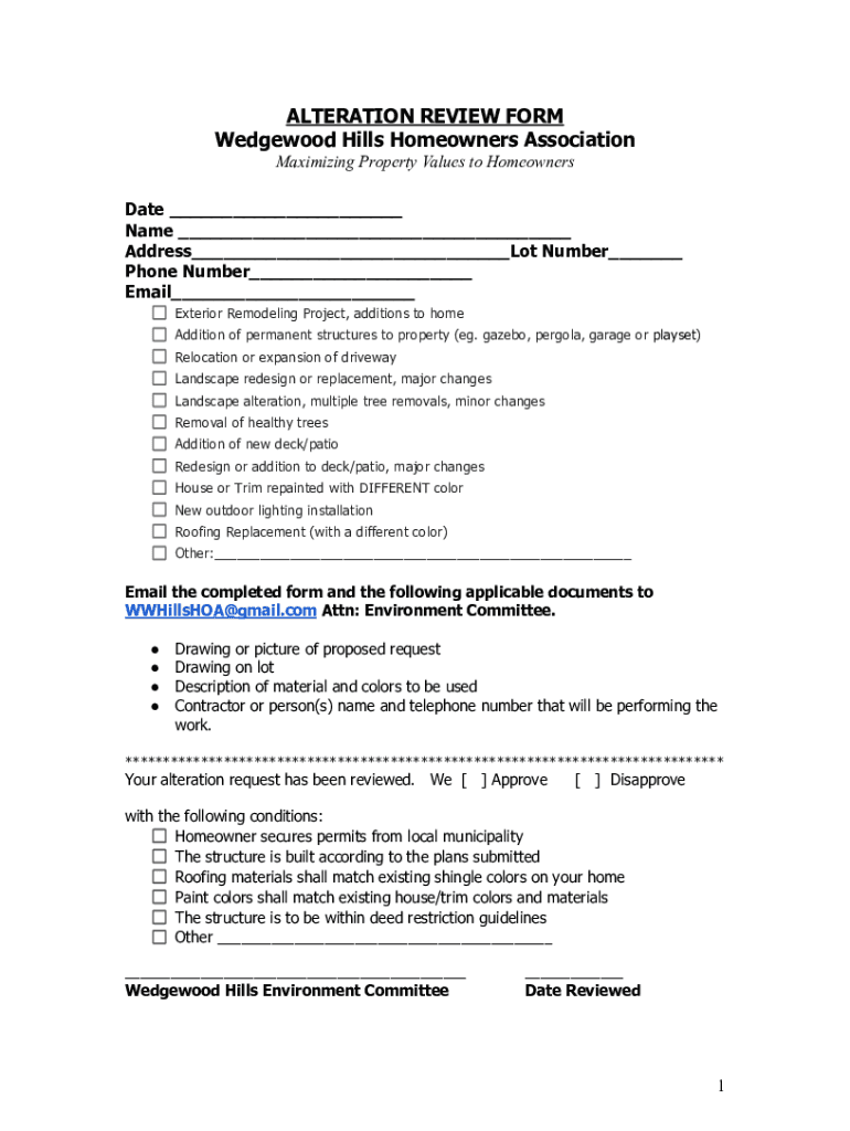 ALTERATION REVIEW FORM Wedgwood Hills Homeowners Association Maximizing Property Values to Homeowners Date Name Address Lot Number Phone Number Email Exterior Remodeling Project, additions to home