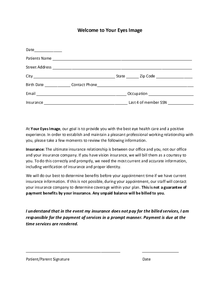 Welcome to Your Eyes Image Date Patients Name Street Address City State Zip Code Birth Date Contact Phone Email Occupation Insurance Last 4 of member SSN At Your Eyes Image, our goal is to provide