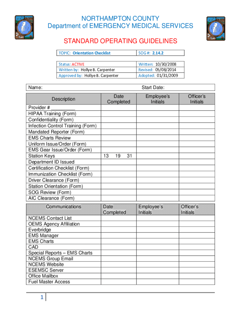 NORTHAMPTON COUNTY Department of EMERGENCY MEDICAL SERVICES STANDARD OPERATING GUIDELINES TOPIC:OrientationChecklistSOG#:2.14.2Status:ACTIVE Written by:Holly. Carpenter Approved by:Holly. CarpenterWritten:10/30/2008