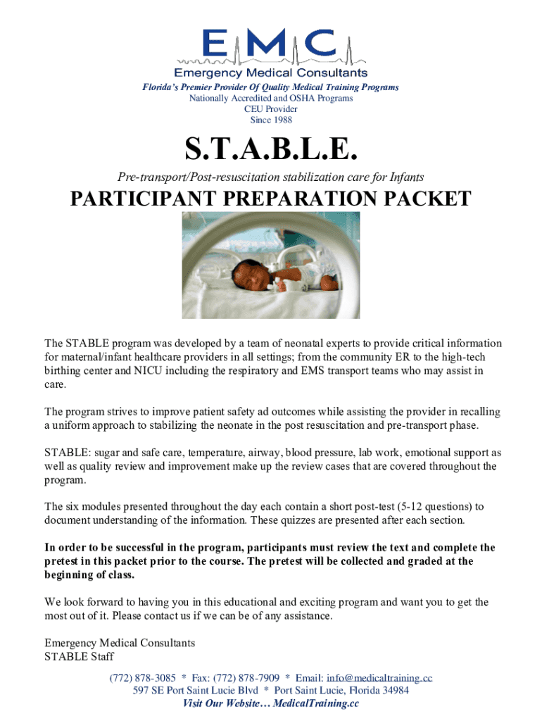 Florida's Premier Provider Of Quality Medical Training Programs Nationally Accredited and OSHA Programs CEU Provider Since 1988S. T.A.B.L.E. Transport/Postresuscitation stabilization care for InfantsPARTICIPANT