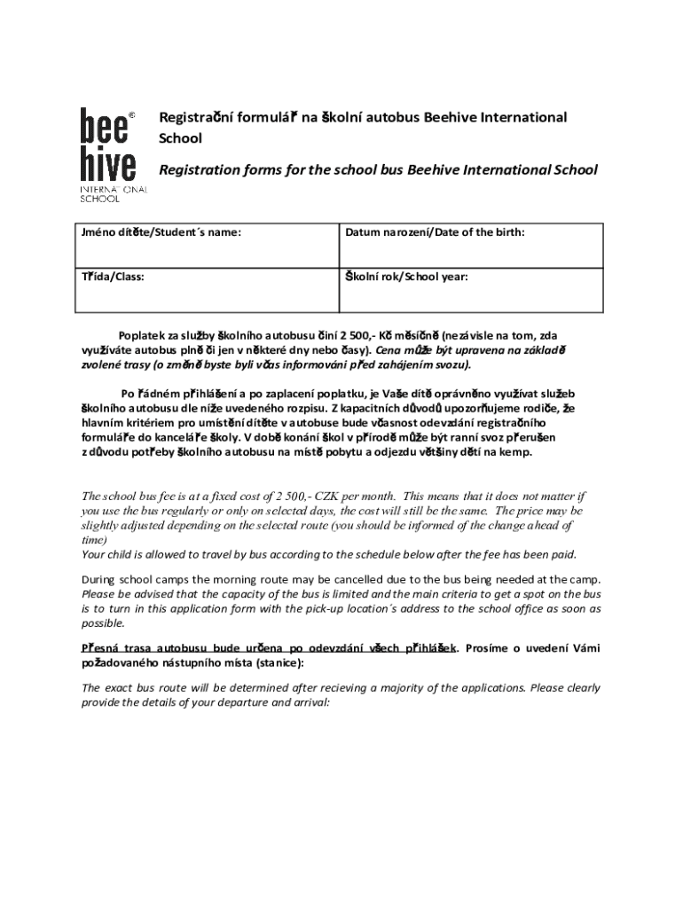 Registration forms for the school bus Beehive International Schooling date/Students name:Datum frozen/Date of the birth:TDA/Class:kiln