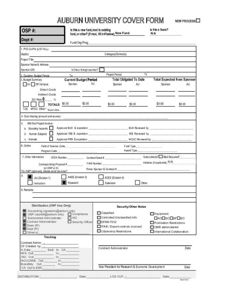 AUBURN UNIVERSITY COVER FORM Is this a new fund, mod to existing New Fund, or other? (If mod, fill in # below) DSP #: Dept #:NEW Processes this a Basic? N/A Fund/Org/Pro 1. PI & Copies (LIST ALL)