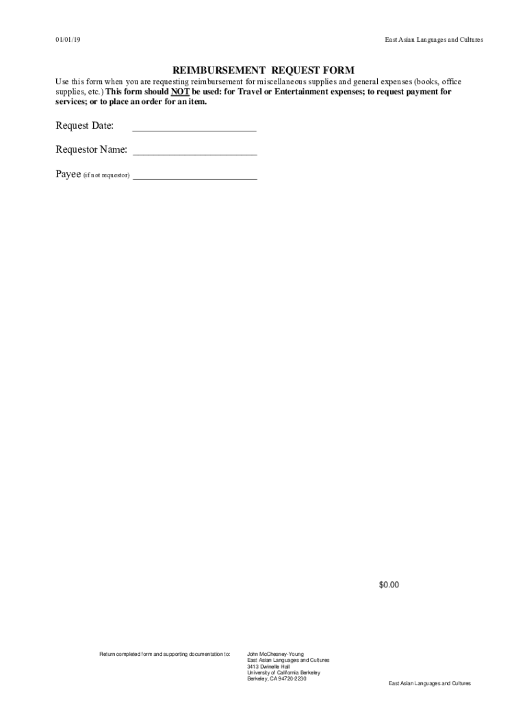 01/01/19East Asian Languages and CulturesREIMBURSEMENT REQUEST Forms this form when you are requesting reimbursement for miscellaneous supplies and general expenses (books, office supplies, etc.)