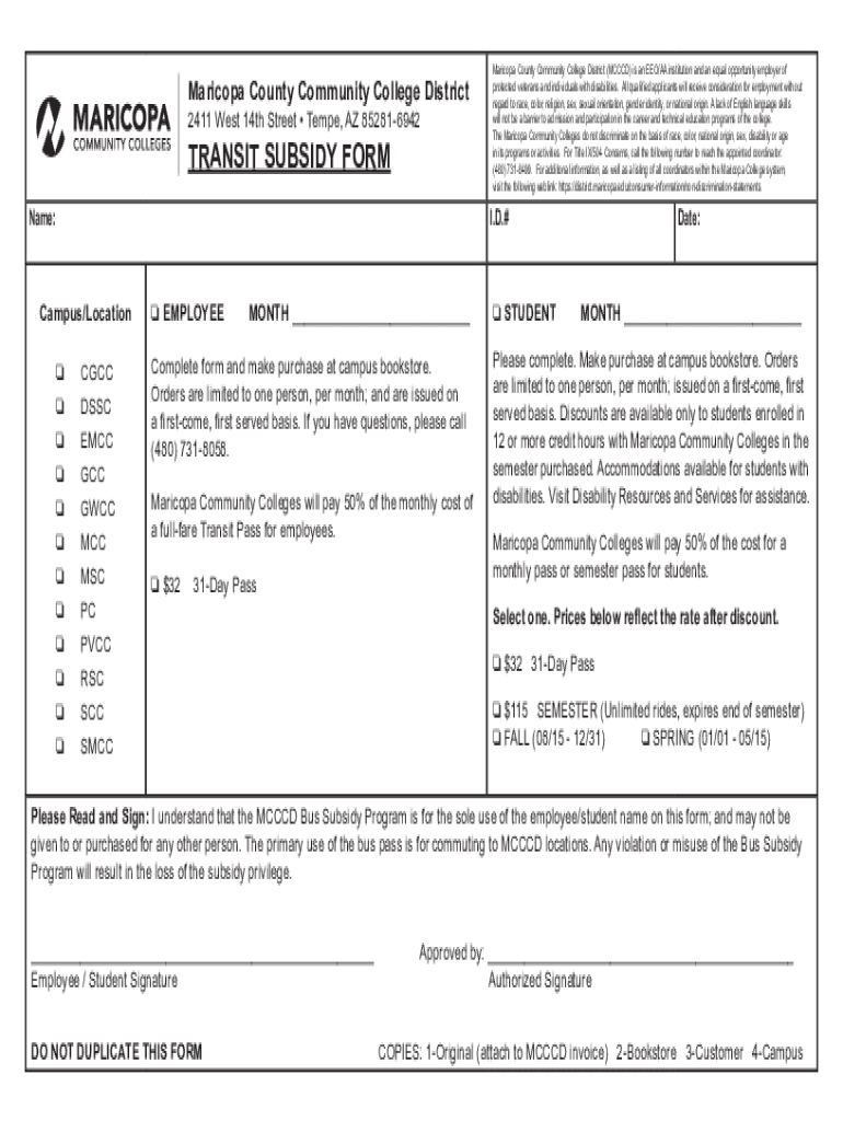 Maricopa County Community College District 2411 West 14th Street Tempe, AZ 852816942TRANSIT SUBSIDY FORM Name:Campus/Location o CCC o DISC o ECC o GCC o GCC o MCC o MSC o PC o PCC o RSC o SCC o SMCCMaricopa
