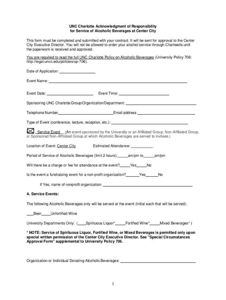 UNC Charlotte Acknowledgment of Responsibility for Service of Alcoholic Beverages at Center City This form must be completed and submitted with your contract. It will be sent for approval to the Center