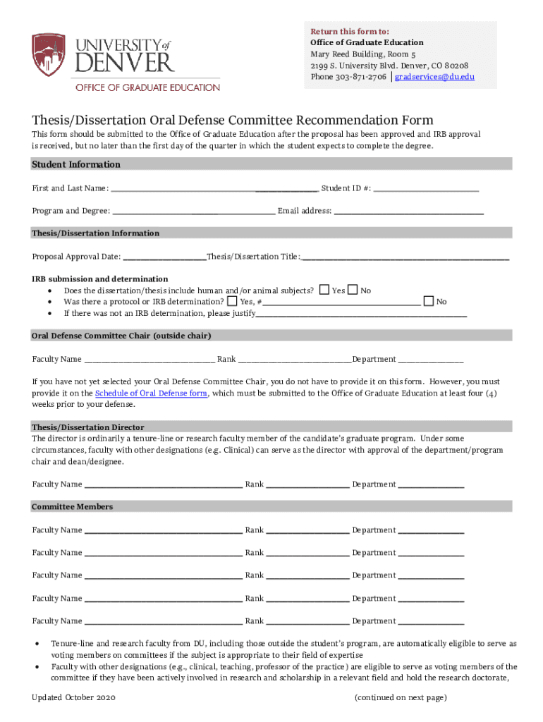 Return this form to: Office of Graduate from Education Mary Reed Building, Room 5 2199 S. University Blvd. Denver, CO 80208 Phone 3038712706 gradservices@du.eduThesis/Dissertation Oral Defense Committee