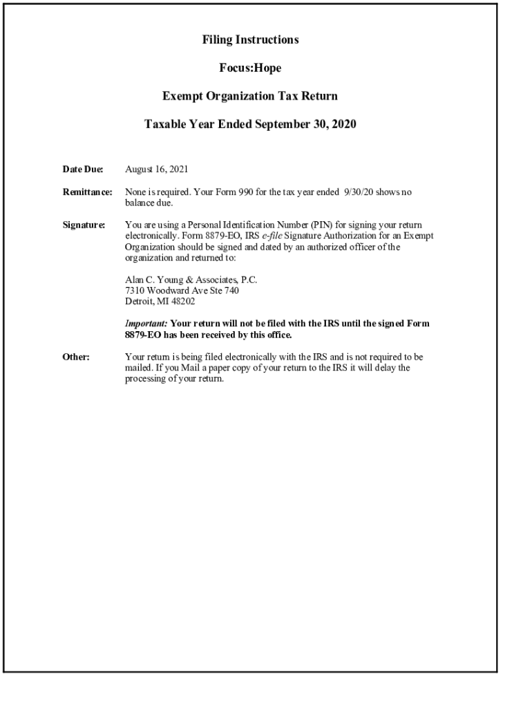 Filing Instructions Focus:Hope Exempt Organization Tax Return Taxable Year Ended September 30, 2020Date Due:August 16, 2021Remittance:None is required. Your Form 990 for the tax year ended 9/30/20