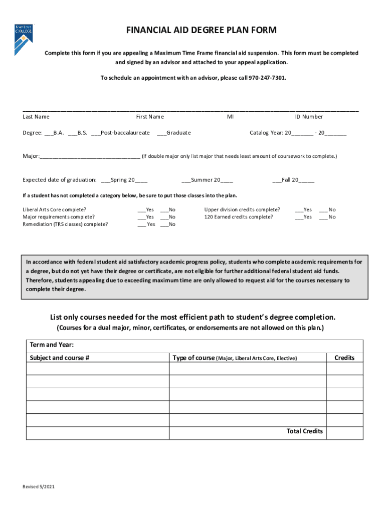 FINANCIAL AID DEGREE PLAN FORM Complete this form if you are appealing a Maximum Time Frame financial aid suspension. This form must be completed and signed by an advisor and attached to your appeal