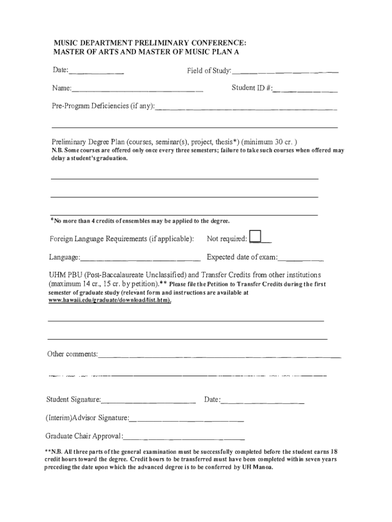 MUSIC DEPARTMENT PRELIMINARY CONFERENCE: MASTER OF ARTS AND MASTER OF MUSIC PLAN A Date: Field of Study: Student ID #: Name: PreProgram Deficiencies (if any): Preliminary Degree Plan (courses, seminar(s),