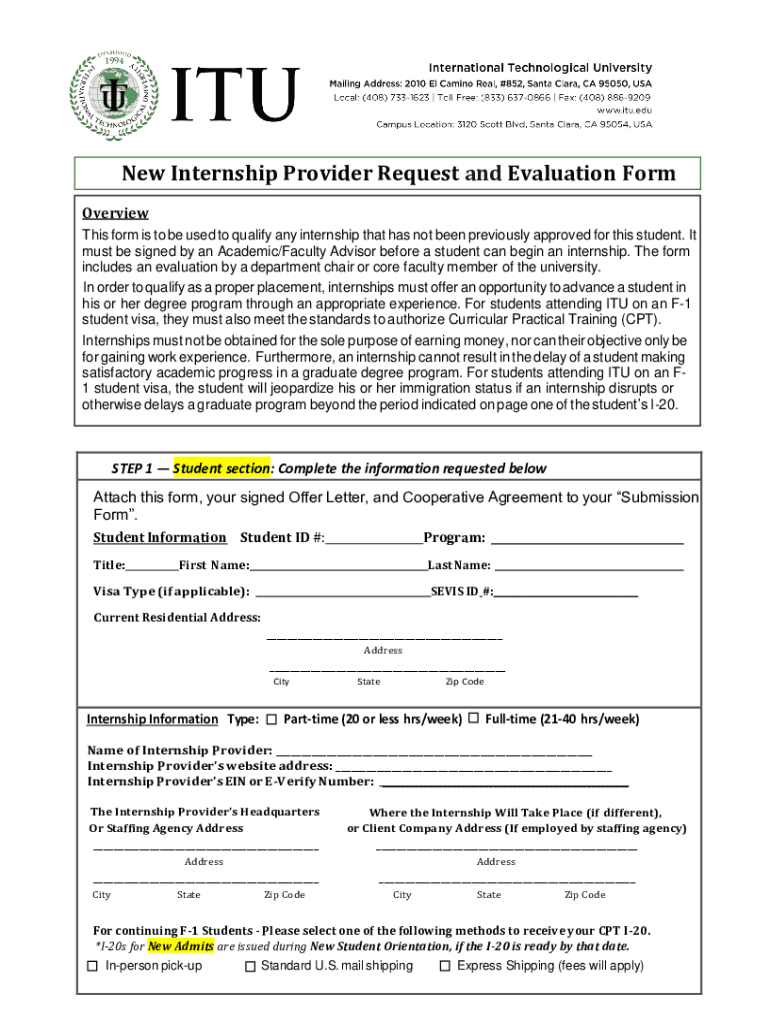 New Internship Provider Request and Evaluation Form Overview This form is to be used to qualify any internship that has not been previously approved for this student. It must be signed by an Academic/Faculty