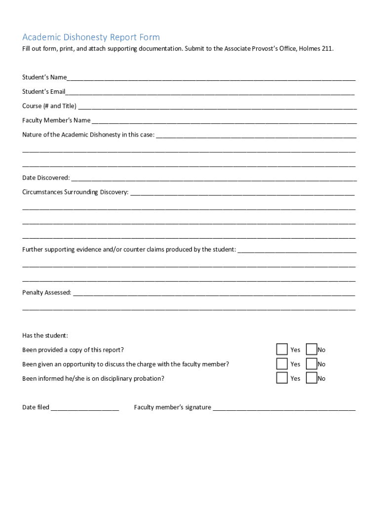 Academic Dishonesty Report Form Fill out form, print, and attach supporting documentation. Submit to the Associate Provosts Office, Holmes 211. Students Name Students Email Course (# and Title) Faculty