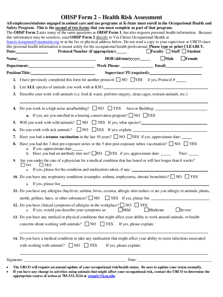 HSP Form 2 Health Risk Assessment All employees/students engaged in animal care and use programs at State must enroll in the Occupational Health and Safety Program. This is the second of two forms
