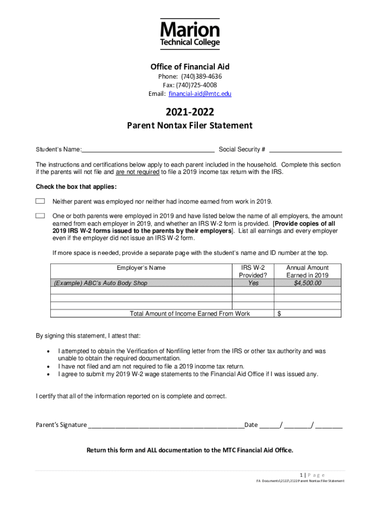 Office of Financial Aid Phone: (740)3894636 Fax: (740)7254008 Email: financial aid MTC.edu20212022 Parent Nontax Filer Statement Students Name: Social Security #The instructions and certifications