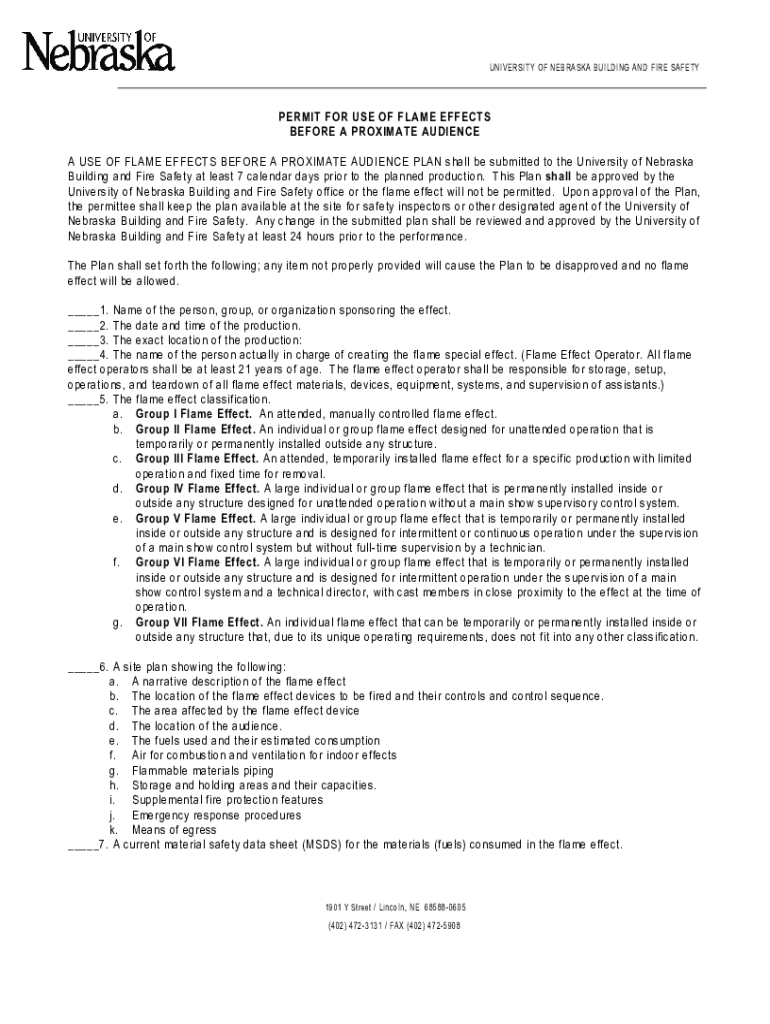 UNIVERSITY OF NEBRASKA BUILDING AND FIRE SAFETYPERMIT FOR USE OF FLAME EFFECTS BEFORE A PROXIMATE AUDIENCE A USE OF FLAME EFFECTS BEFORE A PROXIMATE AUDIENCE PLAN shall be submitted to the University